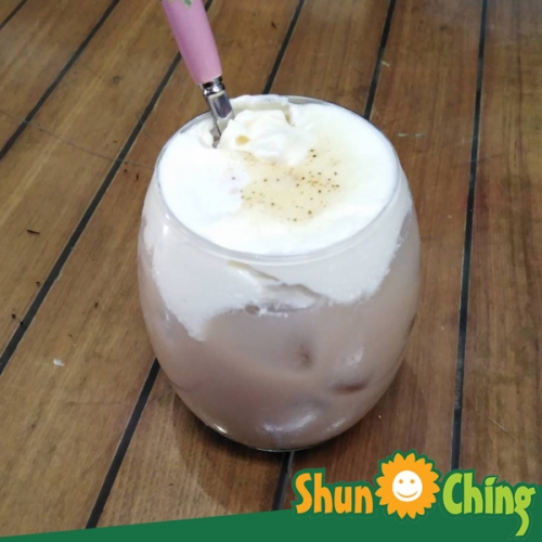 步驟四、準備冰塊,將奶茶(或咖啡)倒入其八分滿,將蛋糕布蕾粉填入飲品中且抹平於杯口。