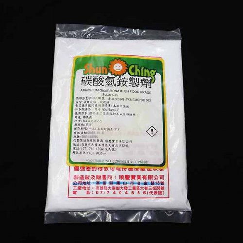 碳酸氫銨(NH4HCO3)是一種離子化合物,碳酸氫銨俗稱銨粉,為白色結晶可溶入於水,碳酸氫銨的穩定性差,在高溫或重潮濕環境時容易分解放出氨氣即一般人俗稱的「阿摩尼亞」,在常溫下,碳酸氫銨也容易揮發即使溶於水後也不穩定,因此帶有氨的獨特刺鼻氣味。食用級碳酸氫銨是合法的食品添加物,用途是可作為製造油條、餅乾、各式麵粉製品等食品的膨脹劑,本成分內之碳酸鎂應該僅作為防止粉類結塊及保持乾燥之用途故不影響品質。